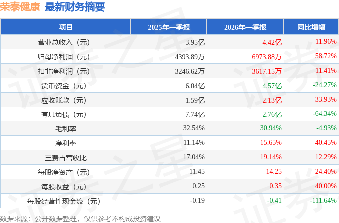据证券之星公开数据整理,近期荣泰健康(603579)发布2026年一季报。截至本报告期末,公司营业总收入4.42亿元,同比上升11.96%,归母净利润6973.88万元,同比上升58.72%。按单季度数据看,第一季度营业总收入4.42亿元,同比上升11.96%,第一季度归母净利润6973.88万元,同比上升58.72%。本报告期荣泰健康应收账款上升,应收账款同比增幅达33.93%。