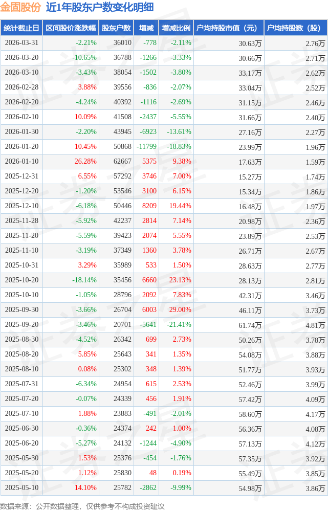 从股价来看,2026年3月20日至2026年3月31日,金固股份区间跌幅为2.21%,在此期间股东户数减少778.0户,减幅为2.11%。