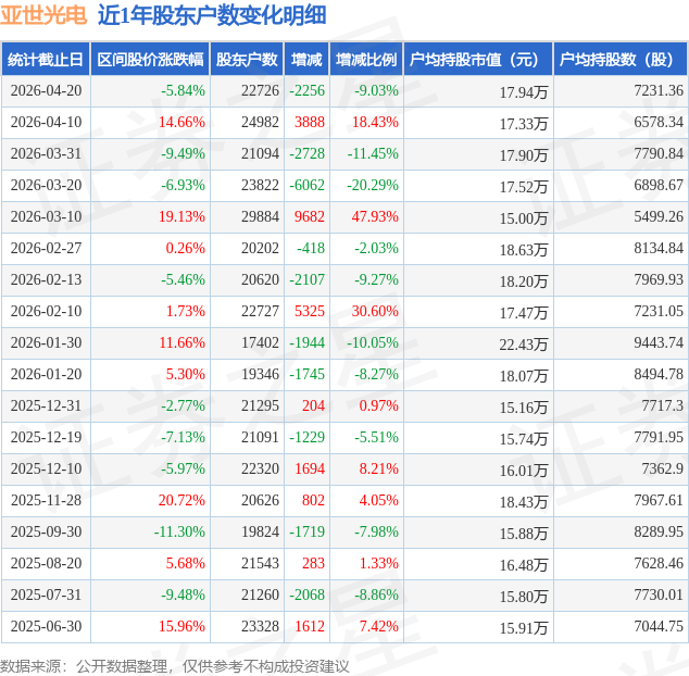 证券之星消息,近日亚世光电披露,截至2026年4月20日公司股东户数为2.27万户,较4月10日减少2256.0户,减幅为9.03%。户均持股数量由上期的6578.0股增加至7231.0股,户均持股市值为17.94万元。