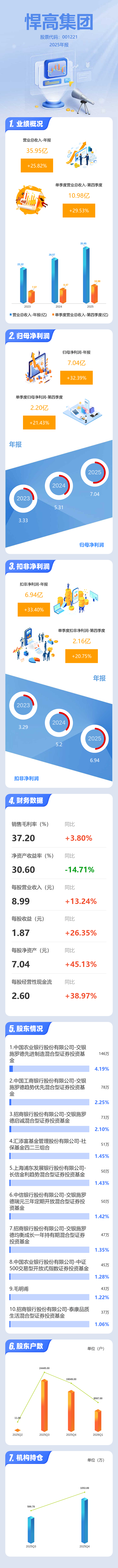 证券之星消息,悍高集团2025年年报显示,当年度公司主营收入35.95亿元,同比上升25.83%;归母净利润7.04亿元,同比上升32.39%;扣非净利润6.94亿元,同比上升33.4%;其中2025年第四季度,公司单季度主营收入10.98亿元,同比上升29.54%;单季度归母净利润2.2亿元,同比上升21.43%;单季度扣非净利润2.16亿元,同比上升20.76%;负债率31.41%,投资收益806.13万元,财务费用-790.08万元,毛利率37.2%。