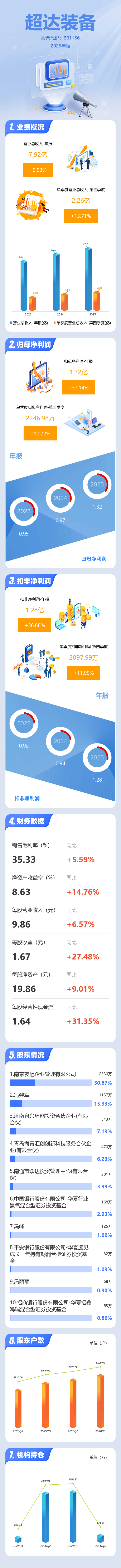 证券之星消息,超达装备2025年年报显示,当年度公司主营收入7.92亿元,同比上升9.94%;归母净利润1.32亿元,同比上升37.14%;扣非净利润1.28亿元,同比上升36.68%;其中2025年第四季度,公司单季度主营收入2.26亿元,同比上升13.72%;单季度归母净利润2246.98万元,同比上升10.73%;单季度扣非净利润2097.99万元,同比上升11.99%;负债率30.3%,投资收益402.01万元,财务费用-2382.76万元,毛利率35.33%。