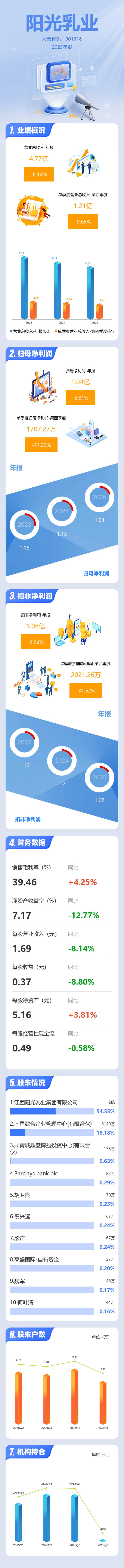 证券之星消息,阳光乳业2025年年报显示,当年度公司主营收入4.77亿元,同比下降8.15%;归母净利润1.04亿元,同比下降8.81%;扣非净利润1.08亿元,同比下降9.93%;其中2025年第四季度,公司单季度主营收入1.21亿元,同比下降9.66%;单季度归母净利润1707.27万元,同比下降41.3%;单季度扣非净利润2021.26万元,同比下降31.52%;负债率4.41%,财务费用-1463.46万元,毛利率39.46%。