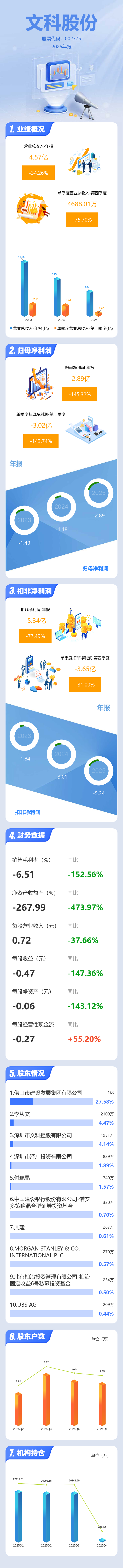 证券之星消息,文科股份2025年年报显示,当年度公司主营收入4.57亿元,同比下降34.26%;归母净利润-2.89亿元,同比下降145.33%;扣非净利润-5.34亿元,同比下降77.5%;其中2025年第四季度,公司单季度主营收入4688.01万元,同比下降75.7%;单季度归母净利润-3.02亿元,同比下降143.75%;单季度扣非净利润-3.65亿元,同比下降31.0%;负债率98.52%,投资收益252.23万元,财务费用1.6亿元,毛利率-6.51%。