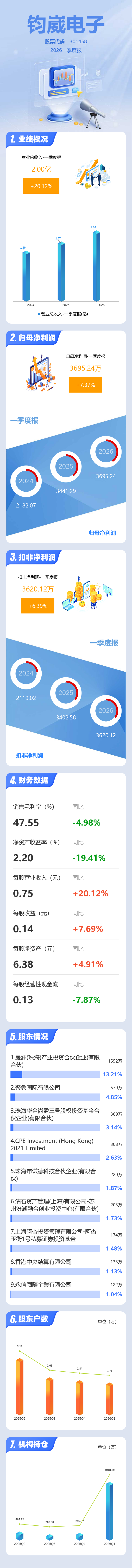 证券之星消息,钧崴电子2026年一季报显示,一季度公司主营收入2.0亿元,同比上升20.13%;归母净利润3695.24万元,同比上升7.38%;扣非净利润3620.12万元,同比上升6.39%;负债率16.3%,投资收益12.5万元,财务费用28.29万元,毛利率47.55%。