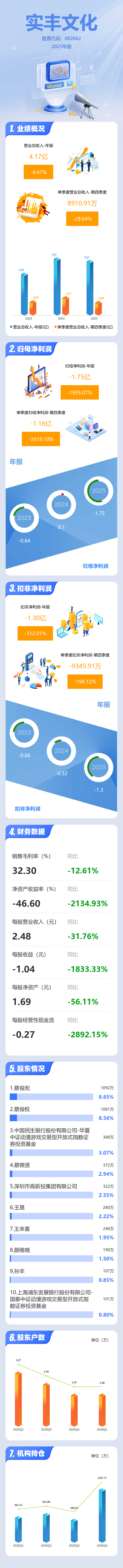 证券之星消息,实丰文化2025年年报显示,当年度公司主营收入4.17亿元,同比下降4.48%;归母净利润-1.75亿元,同比下降1935.07%;扣非净利润-1.3亿元,同比下降312.01%;其中2025年第四季度,公司单季度主营收入8910.91万元,同比下降29.65%;单季度归母净利润-1.16亿元,同比下降2419.1%;单季度扣非净利润-9345.91万元,同比下降198.12%;负债率57.33%,投资收益-3454.86万元,财务费用1100.25万元,毛利率32.3%。