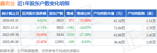 证券之星消息,近日鑫宏业披露,截至2026年3月31日公司股东户数为9023.0户,较12月31日增加971.0户,增幅为12.06%。户均持股数量由上期的1.7万股减少至1.51万股,户均持股市值为61.1万元。