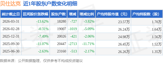 证券之星消息,近日贝仕达克披露,截至2026年3月31日公司股东户数为1.83万户,较2月28日减少727.0户,减幅为3.82%。户均持股数量由上期的1.64万股增加至1.7万股,户均持股市值为23.57万元。