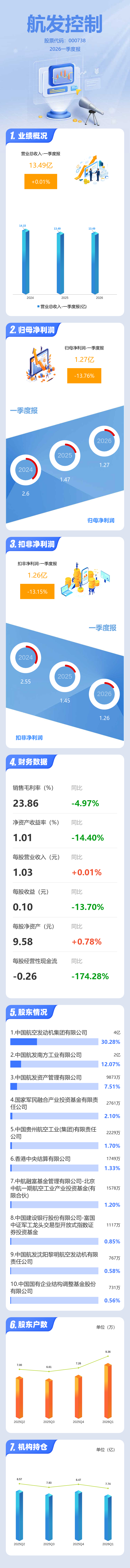 证券之星消息,航发控制2026年一季报显示,一季度公司主营收入13.49亿元,同比上升0.02%;归母净利润1.27亿元,同比下降13.77%;扣非净利润1.26亿元,同比下降13.16%;负债率17.96%,财务费用62.29万元,毛利率23.86%。