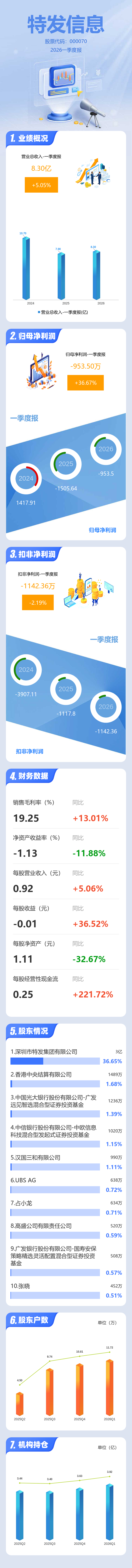 证券之星消息,特发信息2026年一季报显示,一季度公司主营收入8.3亿元,同比上升5.06%;归母净利润-953.5万元,同比上升36.67%;扣非净利润-1142.36万元,同比下降2.2%;负债率78.41%,投资收益533.71万元,财务费用1656.61万元,毛利率19.25%。
