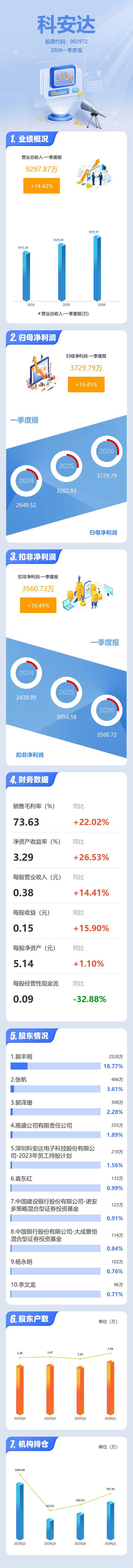 证券之星消息,科安达2026年一季报显示,一季度公司主营收入9297.87万元,同比上升14.43%;归母净利润3729.79万元,同比上升16.45%;扣非净利润3560.72万元,同比上升16.49%;负债率13.92%,投资收益48.68万元,财务费用106.18万元,毛利率73.63%。
