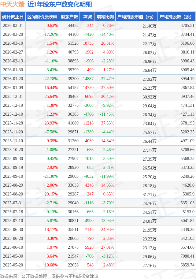 从股价来看,2026年3月20日至2026年3月31日,中天火箭区间涨幅为0.63%,在此期间股东户数增加344.0户,增幅为0.78%。