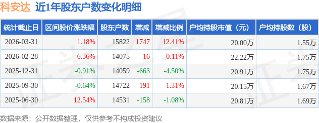 从股价来看,2026年2月28日至2026年3月31日,科安达区间涨幅为1.18%,在此期间股东户数增加1747.0户,增幅为12.41%。