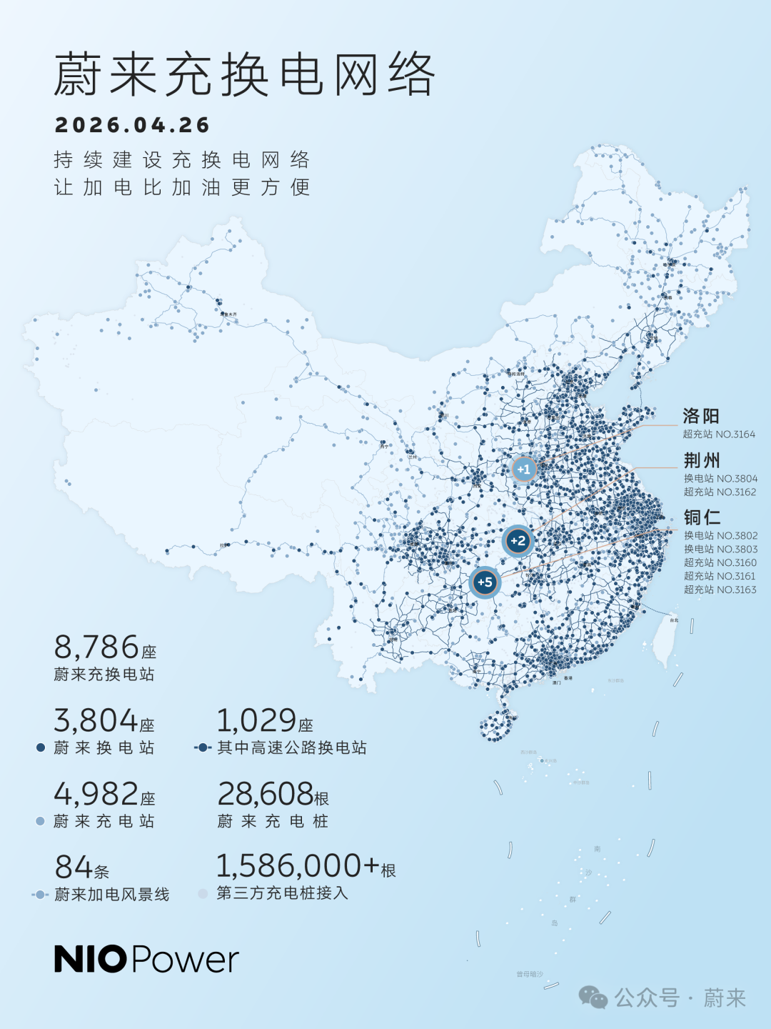 NO.3802 蔚来换电站 | G56杭瑞高速铜仁服务区杭州方向NO.3803 蔚来换电站 | G56杭瑞高速铜仁服务区瑞丽方向NO.3804 蔚来换电站 | 荆州公安县九阳花园NO.3160 蔚来超充站 | G56杭瑞高速铜仁服务区杭州方向NO.3161 蔚来超充站 | G56杭瑞高速铜仁服务区瑞丽方向NO.3162 蔚来超充站 | 荆州公安县九阳花园NO.3163 蔚来超充站 | 铜仁梵净山栖溪酒店NO.3164 蔚来超充站 | 洛阳玄武门大街白马站截至今日,蔚来全国建成8,786座充换电站,其中换电站3,804座,充电站4,982座、充电桩28,608根,累计提供超1亿次换电,持续建设,让加电比加油更方便!#蔚来 #蔚来换电去哪都方便 #蔚来ES9 #蔚来ES8 #蔚来ET5 #蔚来ET5T #蔚来ES6 #蔚来EC6 #蔚来ET9 点击即刻了解蔚来全系车型