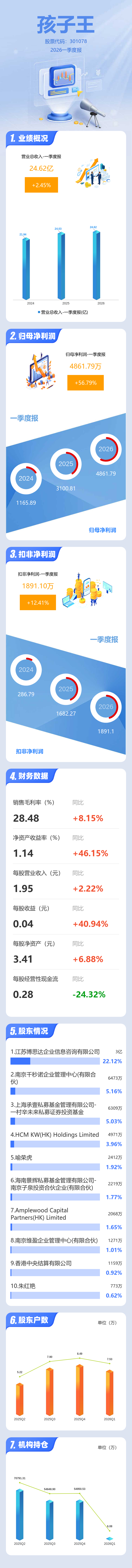 证券之星消息,孩子王2026年一季报显示,一季度公司主营收入24.62亿元,同比上升2.46%;归母净利润4861.79万元,同比上升56.79%;扣非净利润1891.1万元,同比上升12.41%;负债率63.03%,投资收益1218.31万元,财务费用4132.59万元,毛利率28.48%。