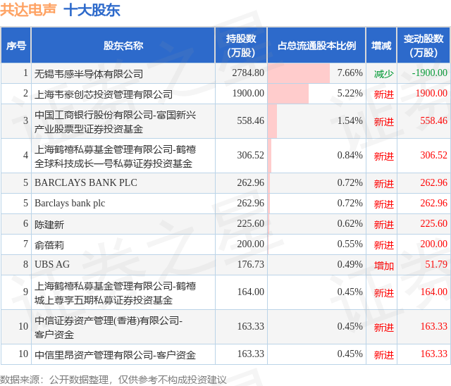 根据共达电声2026年一季报公布的十大股东详情如下: