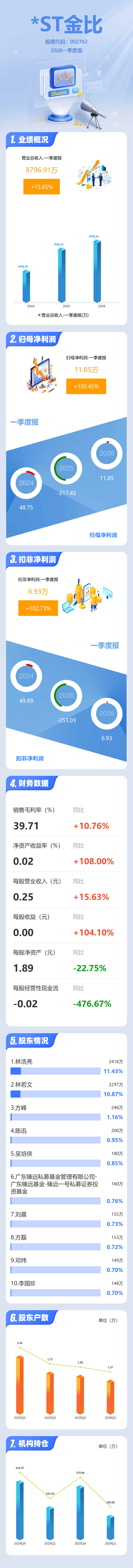 证券之星消息,*ST金比2026年一季报显示,一季度公司主营收入8796.91万元,同比上升15.65%;归母净利润11.85万元,同比上升105.45%;扣非净利润6.93万元,同比上升102.74%;负债率11.96%,投资收益-8.25万元,财务费用22.13万元,毛利率39.71%。