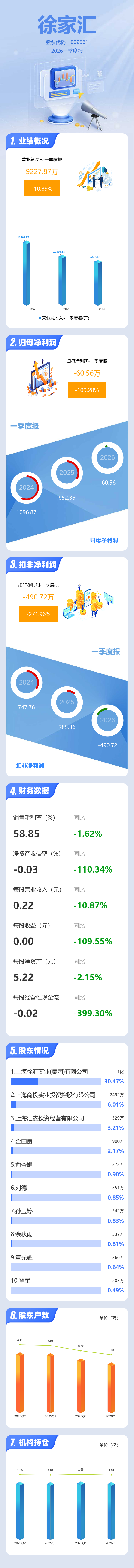 证券之星消息,徐家汇2026年一季报显示,一季度公司主营收入9227.87万元,同比下降10.9%;归母净利润-60.56万元,同比下降109.28%;扣非净利润-490.72万元,同比下降271.96%;负债率13.59%,投资收益399.64万元,财务费用-210.34万元,毛利率58.85%。