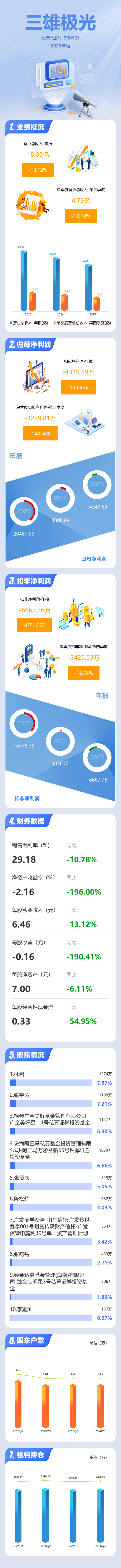 证券之星消息,三雄极光2025年年报显示,当年度公司主营收入18.05亿元,同比下降13.12%;归母净利润-4349.59万元,同比下降190.45%;扣非净利润-6667.76万元,同比下降871.67%;其中2025年第四季度,公司单季度主营收入4.73亿元,同比下降19.11%;单季度归母净利润-3299.81万元,同比下降148.69%;单季度扣非净利润-3425.53万元,同比下降18.79%;负债率33.71%,投资收益1727.22万元,财务费用1.53万元,毛利率29.18%。