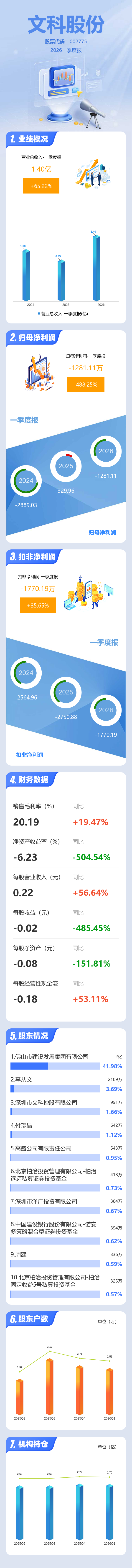 证券之星消息,文科股份2026年一季报显示,一季度公司主营收入1.4亿元,同比上升65.23%;归母净利润-1281.11万元,同比下降488.26%;扣非净利润-1770.19万元,同比上升35.65%;负债率98.69%,财务费用3460.59万元,毛利率20.19%。