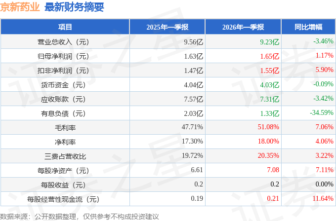 据证券之星公开数据整理,近期京新药业(002020)发布2026年一季报。截至本报告期末,公司营业总收入9.23亿元,同比下降3.46%,归母净利润1.65亿元,同比上升1.17%。按单季度数据看,第一季度营业总收入9.23亿元,同比下降3.46%,第一季度归母净利润1.65亿元,同比上升1.17%。本报告期京新药业盈利能力上升,毛利率同比增幅7.06%,净利率同比增幅4.06%。