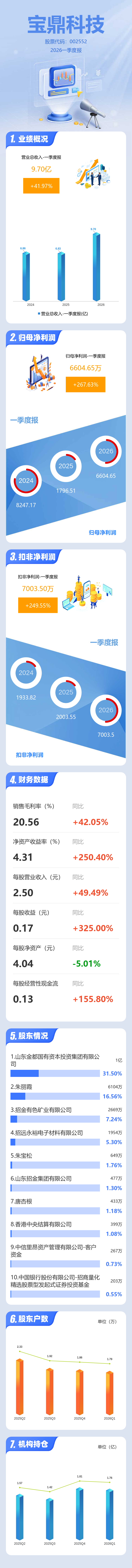 证券之星消息,宝鼎科技2026年一季报显示,一季度公司主营收入9.7亿元,同比上升41.97%;归母净利润6604.65万元,同比上升267.64%;扣非净利润7003.5万元,同比上升249.55%;负债率58.32%,投资收益-167.62万元,财务费用1504.65万元,毛利率20.56%。