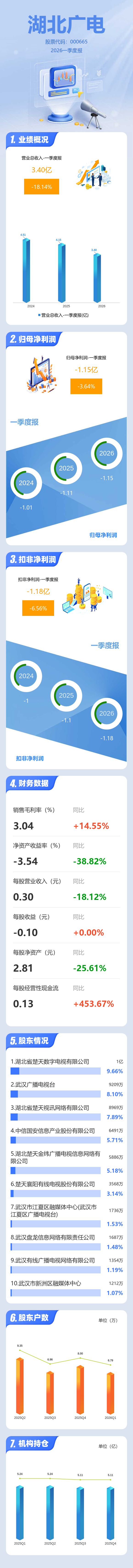 证券之星消息,湖北广电2026年一季报显示,一季度公司主营收入3.4亿元,同比下降18.14%;归母净利润-1.15亿元,同比下降3.64%;扣非净利润-1.18亿元,同比下降6.57%;负债率65.22%,投资收益9.25万元,财务费用2511.03万元,毛利率3.04%。