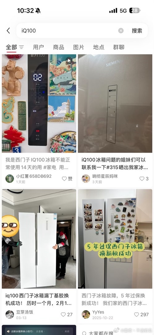 评论区及相关社交平台大量用户跟帖维权,集中反映西门子iQ100冰箱使用3–5年就出现故障、售后推诿、维权困难,部分用户历经长期交涉才成功换新。