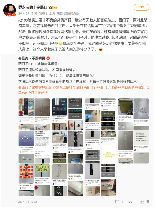 快科技4月27日消息,罗永浩今天再次发文炮轰西门子冰箱,直指西门子iQ100冰箱为设计不良的劣质产品,存在批量性质量问题,而西门子官方长期回避、拒不承认缺陷。