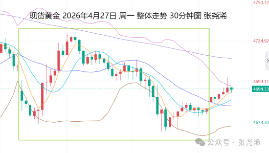 4月28日:上交易日周一(4月27日):国际黄金震荡收跌,美伊海峡的博弈问题持续,令金价维持调整状态,并继续运行在100日均线及中轨线下方,空头仍占据优势,暗示短期仍有望回撤至4550美元或更低位置的预期。