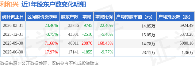从股价来看,2025年12月31日至2026年3月31日,利和兴区间跌幅为23.46%,在此期间股东户数减少9745.0户,减幅为22.4%。