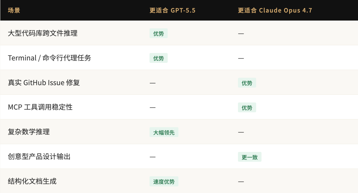 不过,“感觉”和“测评”之间还有落差。Every的独立评测指出:GPT-5.5在速度上明显快于Opus 4.7,处理有结构化输出需求的任务(报告、课程大纲、会议纪要)表现出色;但在从零开始的创意产品设计上,“细节好但整体感觉随机”,还没到能完全替代Claude的程度。两款模型目前各有擅长的场景,并非简单的谁碾压谁。