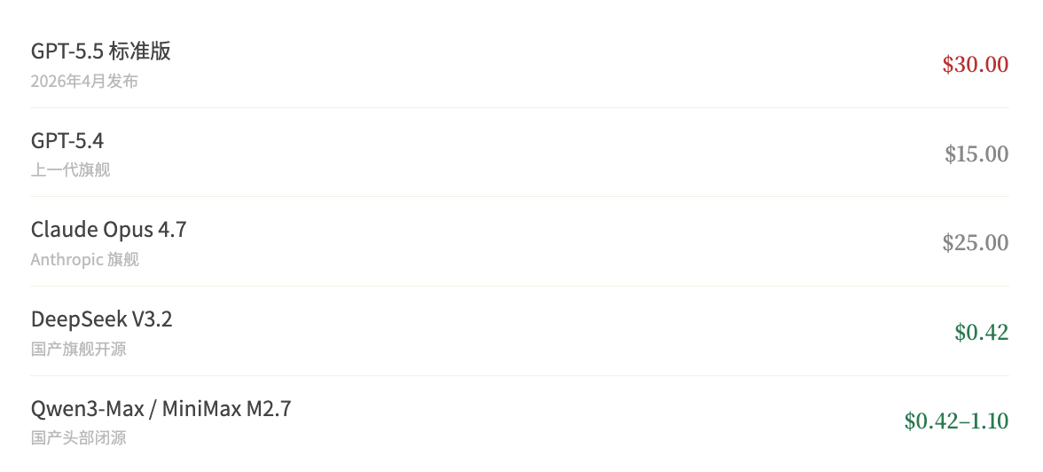 GPT-5.5输出端单价$30,DeepSeek V3.2是$0.42。差距是71倍。GPT-5.4时代已经存在的35倍差距,这次直接翻了一番。