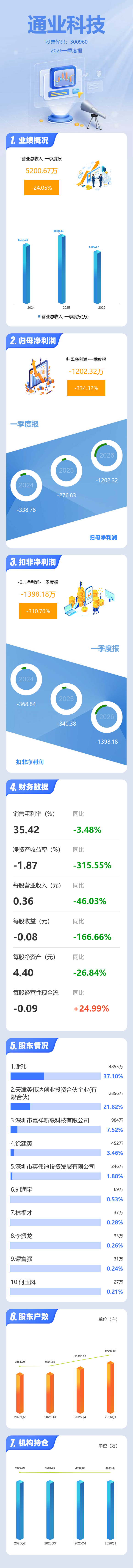 证券之星消息,通业科技2026年一季报显示,一季度公司主营收入5200.67万元,同比下降24.06%;归母净利润-1202.32万元,同比下降334.32%;扣非净利润-1398.18万元,同比下降310.77%;负债率42.41%,投资收益37.42万元,财务费用121.56万元,毛利率35.41%。