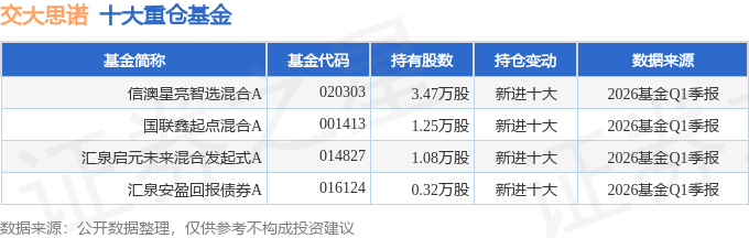 持有交大思诺最多的基金为信澳星亮智选混合A,目前规模为0.27亿元,最新净值2.0473(4月27日),较上一交易日上涨1.34%,近一年上涨45.99%。该基金现任基金经理为冯玺祥。