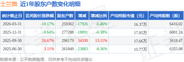 证券之星消息,近日士兰微披露,截至2026年3月31日公司股东户数为25.94万户,较12月31日减少1.79万户,减幅为6.46%。户均持股数量由上期的6001.0股增加至6416.0股,户均持股市值为16.37万元。
