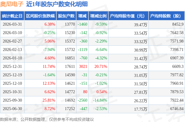 从股价来看,2026年3月10日至2026年3月31日,奥尼电子区间涨幅为6.38%,在此期间股东户数减少1460.0户,减幅为9.59%。