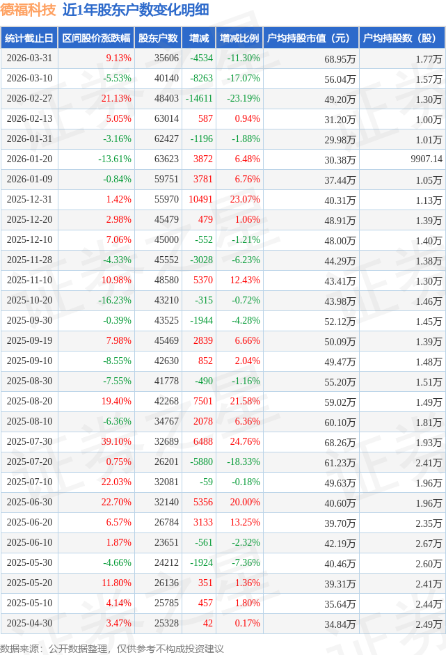从股价来看,2026年3月10日至2026年3月31日,德福科技区间涨幅为9.13%,在此期间股东户数减少4534.0户,减幅为11.3%。