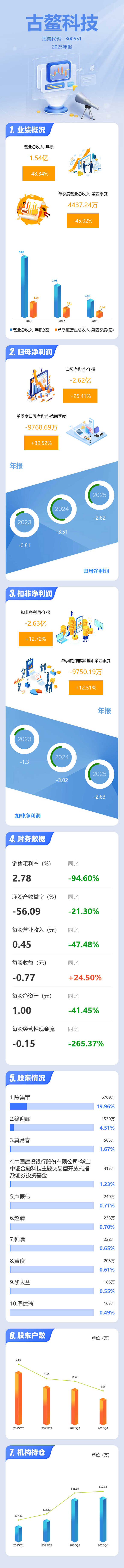 证券之星消息,古鳌科技2025年年报显示,当年度公司主营收入1.54亿元,同比下降48.35%;归母净利润-2.62亿元,同比上升25.41%;扣非净利润-2.63亿元,同比上升12.73%;其中2025年第四季度,公司单季度主营收入4437.24万元,同比下降45.03%;单季度归母净利润-9768.69万元,同比上升39.53%;单季度扣非净利润-9750.19万元,同比上升12.52%;负债率24.73%,投资收益-1.3亿元,财务费用-196.97万元,毛利率2.78%。