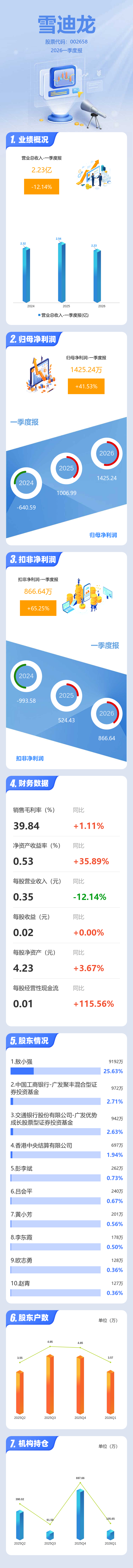 证券之星消息,雪迪龙2026年一季报显示,一季度公司主营收入2.23亿元,同比下降12.14%;归母净利润1425.24万元,同比上升41.53%;扣非净利润866.64万元,同比上升65.26%;负债率12.68%,投资收益530.77万元,财务费用-456.68万元,毛利率39.84%。