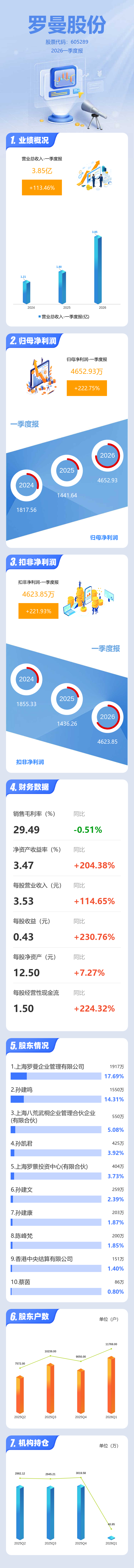 证券之星消息,罗曼股份2026年一季报显示,一季度公司主营收入3.85亿元,同比上升113.46%;归母净利润4652.93万元,同比上升222.75%;扣非净利润4623.85万元,同比上升221.94%;负债率50.47%,财务费用260.18万元,毛利率29.49%。