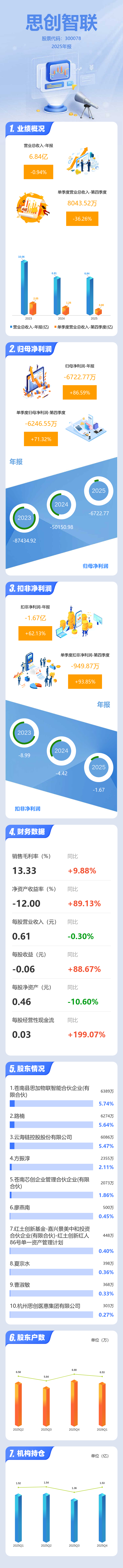 证券之星消息,思创智联2025年年报显示,当年度公司主营收入6.84亿元,同比下降0.94%;归母净利润-6722.77万元,同比上升86.59%;扣非净利润-1.67亿元,同比上升62.14%;其中2025年第四季度,公司单季度主营收入8043.52万元,同比下降36.26%;单季度归母净利润-6246.55万元,同比上升71.33%;单季度扣非净利润-949.87万元,同比上升93.86%;负债率45.38%,投资收益1.06亿元,财务费用2593.69万元,毛利率13.33%。