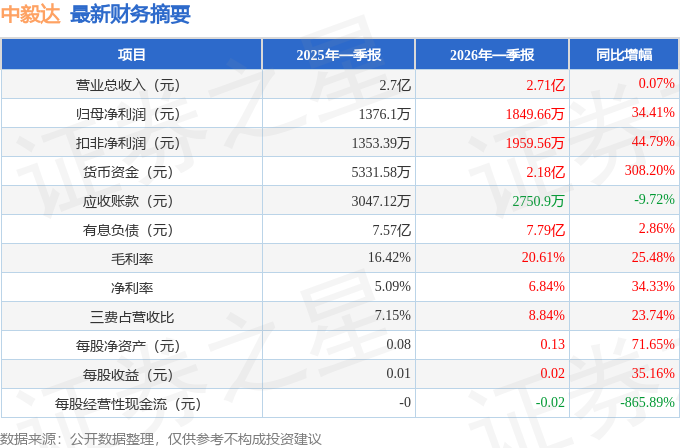 据证券之星公开数据整理,近期中毅达(600610)发布2026年一季报。截至本报告期末,公司营业总收入2.71亿元,同比上升0.07%,归母净利润1849.66万元,同比上升34.41%。按单季度数据看,第一季度营业总收入2.71亿元,同比上升0.07%,第一季度归母净利润1849.66万元,同比上升34.41%。本报告期中毅达盈利能力上升,毛利率同比增幅25.48%,净利率同比增幅34.33%。