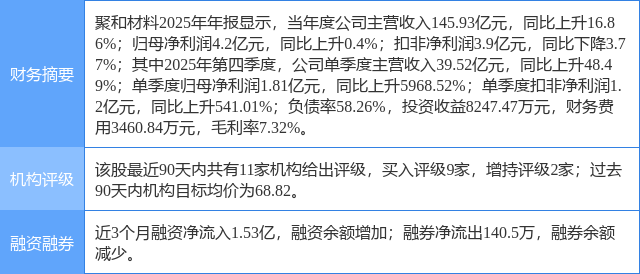 2026年4月1日,东吴证券研究员曾朵红,郭亚男,徐铖嵘发布了对聚和材料的研报《2025年报点评:浆料保持龙头地位,拓展半导体业务矩阵》,该研报对聚和材料给出“买入”评级。研报中预计公司26/27年归母净利润为5/6.5亿元(原预期5/6.5亿元),新增28年归母净利润预测8.1亿元,同比+19%/+29%/+25%。维持“买入”评级。证券之星数据中心根据近三年发布的研报数据计算,该研报作者对此股的盈利预测准确度为46.81%。