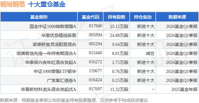 根据2026基金Q1季报公募基金重仓股数据,重仓该股的公募基金共7家,其中持有数量最多的公募基金为国金基金的国金中证1000指数增强A。国金中证1000指数增强A目前规模为2.01亿元,最新净值1.508(4月24日),较上一交易日下跌0.55%,近一年上涨83.51%。该公募基金现任基金经理为李洪超。李洪超在任的基金产品包括:国金300指数增强A,管理时间为2025年7月24日至今,期间收益率为22.85%。