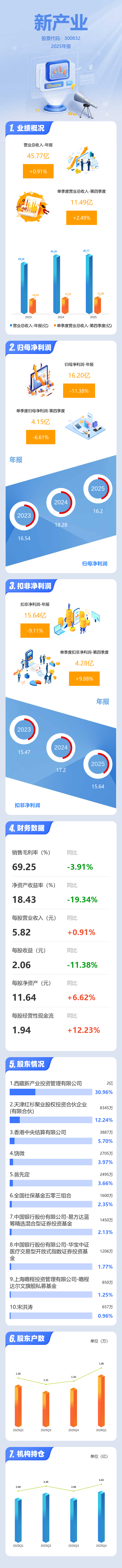 证券之星消息,新产业2025年年报显示,当年度公司主营收入45.77亿元,同比上升0.91%;归母净利润16.2亿元,同比下降11.39%;扣非净利润15.64亿元,同比下降9.12%;其中2025年第四季度,公司单季度主营收入11.49亿元,同比上升2.5%;单季度归母净利润4.15亿元,同比下降6.61%;单季度扣非净利润4.28亿元,同比上升9.88%;负债率8.01%,投资收益5737.47万元,财务费用-1860.36万元,毛利率69.25%。