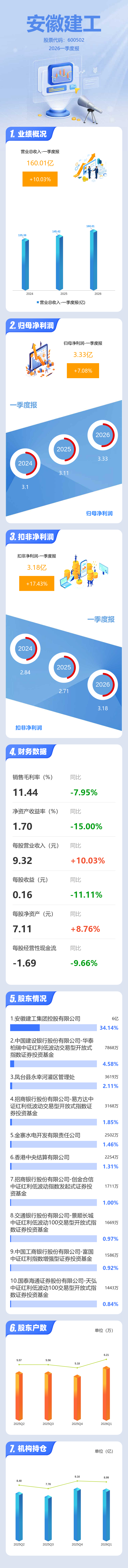 证券之星消息,安徽建工2026年一季报显示,一季度公司主营收入160.01亿元,同比上升10.03%;归母净利润3.33亿元,同比上升7.08%;扣非净利润3.18亿元,同比上升17.44%;负债率85.41%,投资收益929.37万元,财务费用4.57亿元,毛利率11.44%。