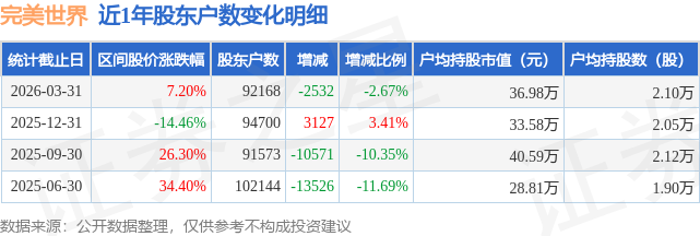 从股价来看,2025年12月31日至2026年3月31日,完美世界区间涨幅为7.2%,在此期间股东户数减少2532.0户,减幅为2.67%。
