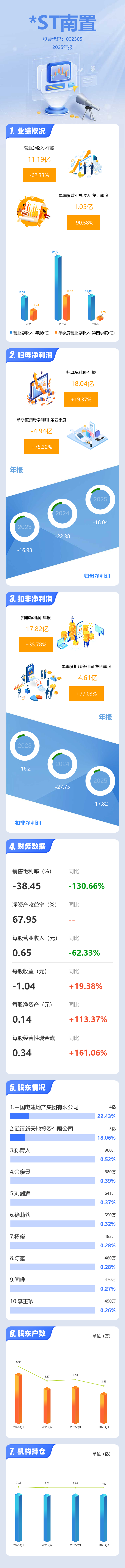 证券之星消息,*ST南置2025年年报显示,当年度公司主营收入11.19亿元,同比下降62.33%;归母净利润-18.04亿元,同比上升19.38%;扣非净利润-17.82亿元,同比上升35.78%;其中2025年第四季度,公司单季度主营收入1.05亿元,同比下降90.59%;单季度归母净利润-4.94亿元,同比上升75.33%;单季度扣非净利润-4.61亿元,同比上升77.03%;负债率63.63%,投资收益-1.55亿元,财务费用6.3亿元,毛利率-38.45%。