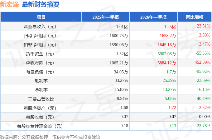 据证券之星公开数据整理,近期新宏泽(002836)发布2026年一季报。截至本报告期末,公司营业总收入1.25亿元,同比上升23.51%,归母净利润1658.2万元,同比上升3.59%。按单季度数据看,第一季度营业总收入1.25亿元,同比上升23.51%,第一季度归母净利润1658.2万元,同比上升3.59%。本报告期新宏泽应收账款上升,应收账款同比增幅达452.39%。