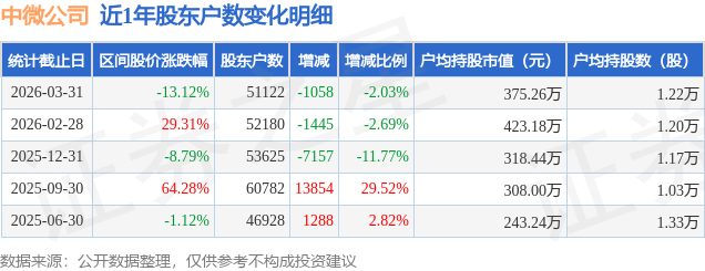 证券之星消息,近日中微公司披露,截至2026年3月31日公司股东户数为5.11万户,较2月28日减少1058.0户,减幅为2.03%。户均持股数量由上期的1.2万股增加至1.22万股,户均持股市值为375.26万元。
